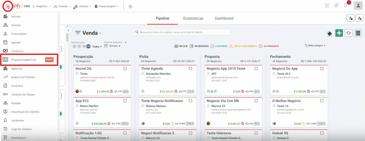 1. Acessando a Proposta Digital Loft pelo menu lateral do CRM