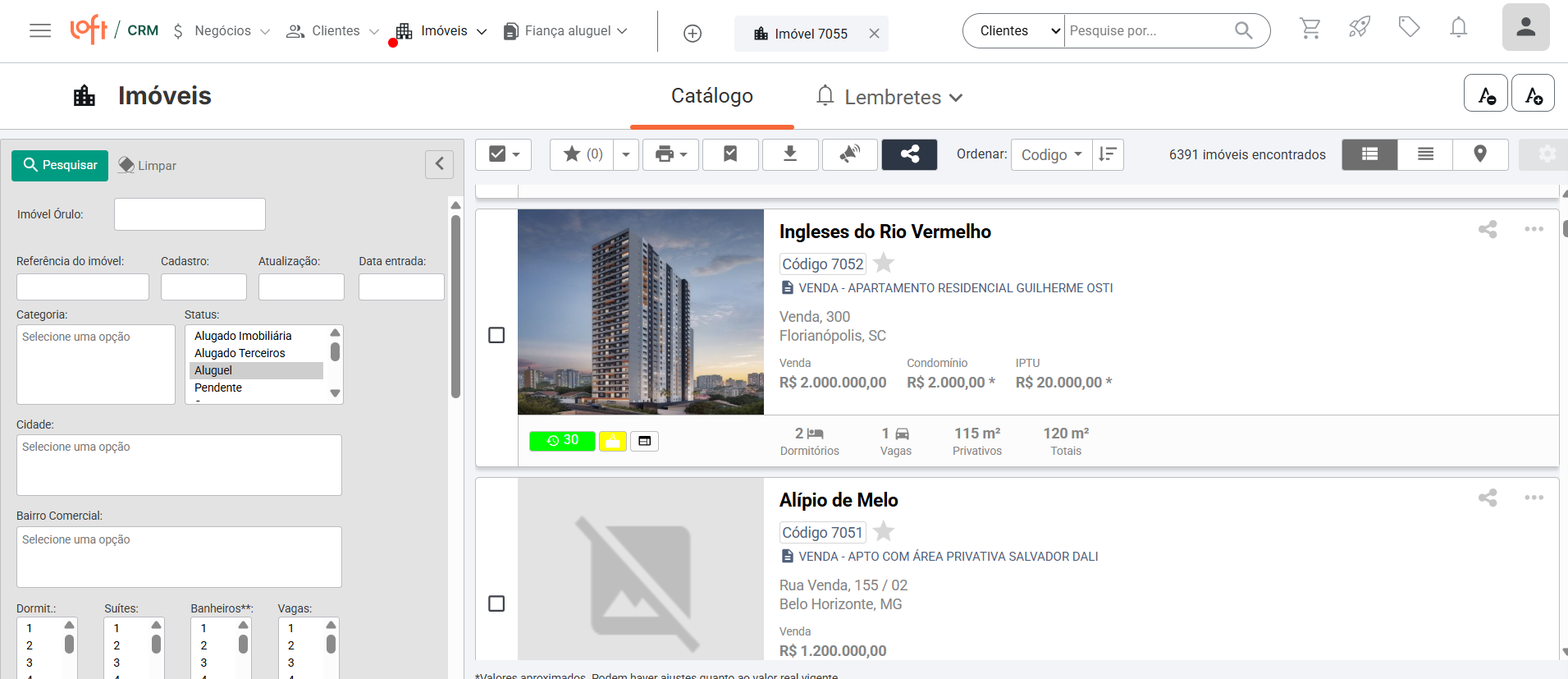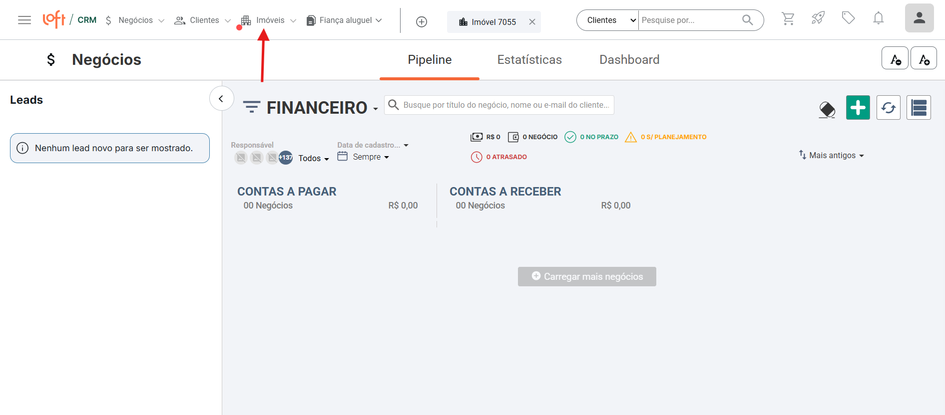 • Através da aba de imóveis no menu superior, podemos acessar os imóveis cadastrados em seu CRM