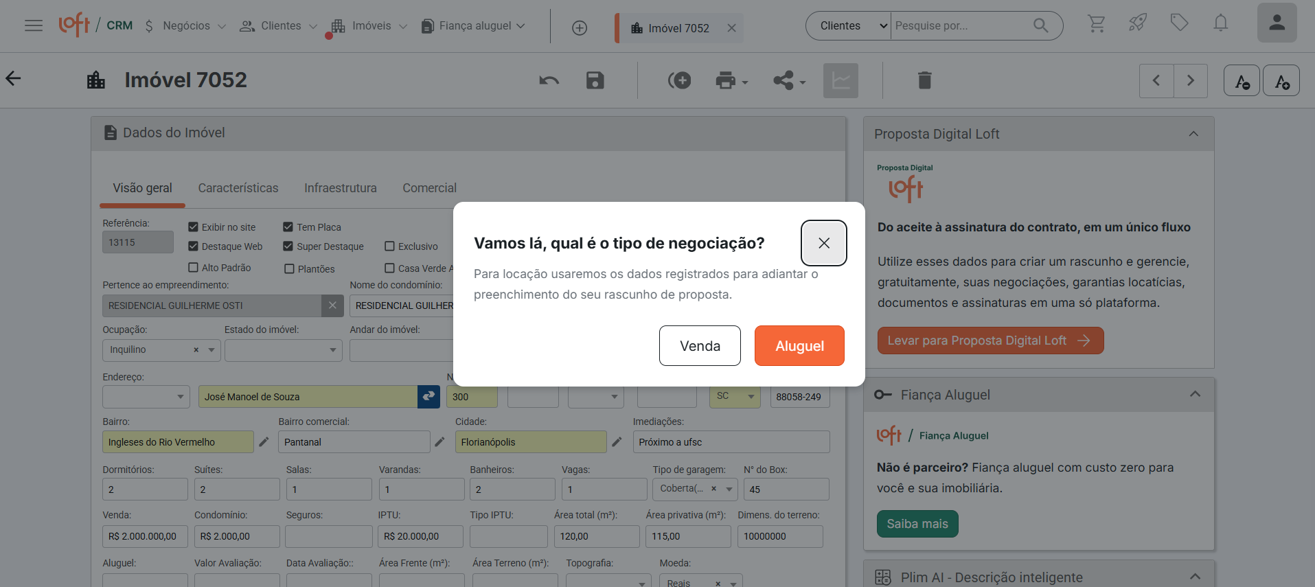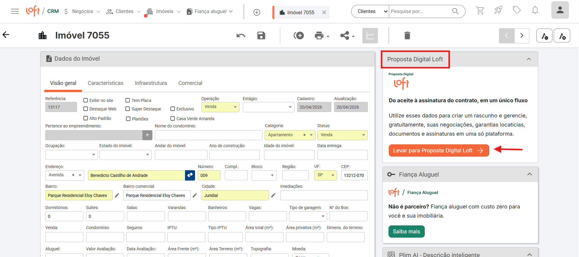 • Dentro do cadastro do imóvel, possui uma opção no canto direito da tela sobre a Proposta Digital Loft