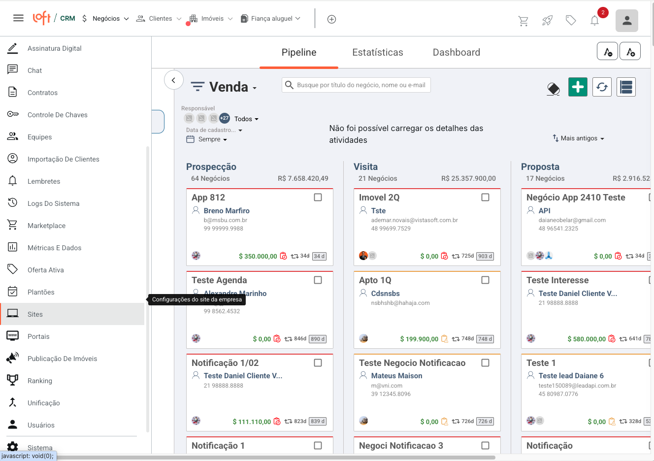 1 ) Acessar o CMS de configuração do Site a partir do Menu Lateral “Sites” no Loft/ CRM;