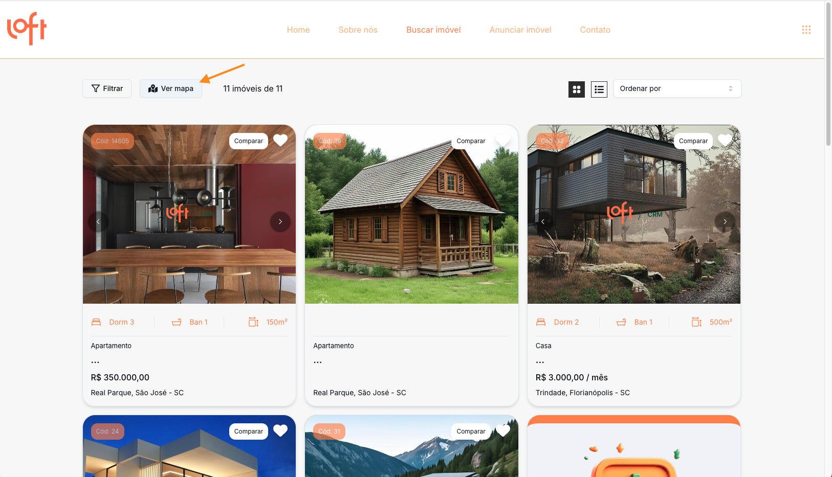 Basta clicar na opção “Ver mapa” na tela de Busca de imóveis para que o cliente consiga navegar pelo mapa: