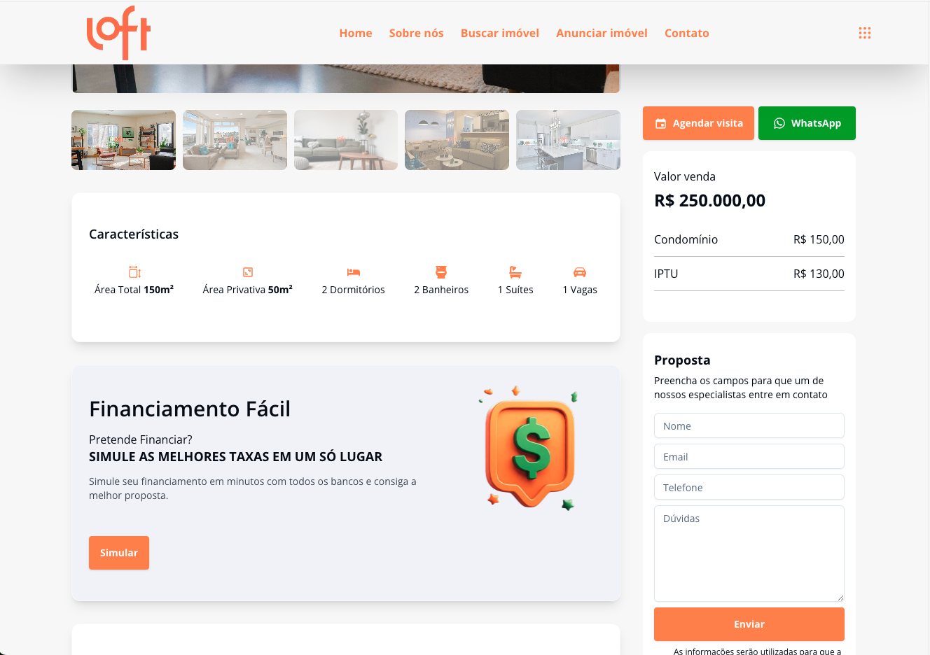 Quando o cliente interagir com o Simulador, geraremos um Lead para sua imobiliária direto no seu CRM e redirecionaremos o cliente para o Simulador Loft, onde ele conseguirá ver opções de Financiamento para os imóveis que tem interesse: