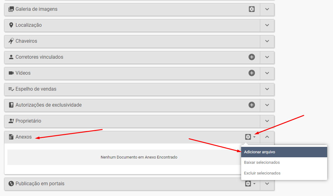 Ao abrir um cadastro de imóvel, podemos localizar na barra “Anexos” deslizando abaixo da página, ilustrado na imagem abaixo: