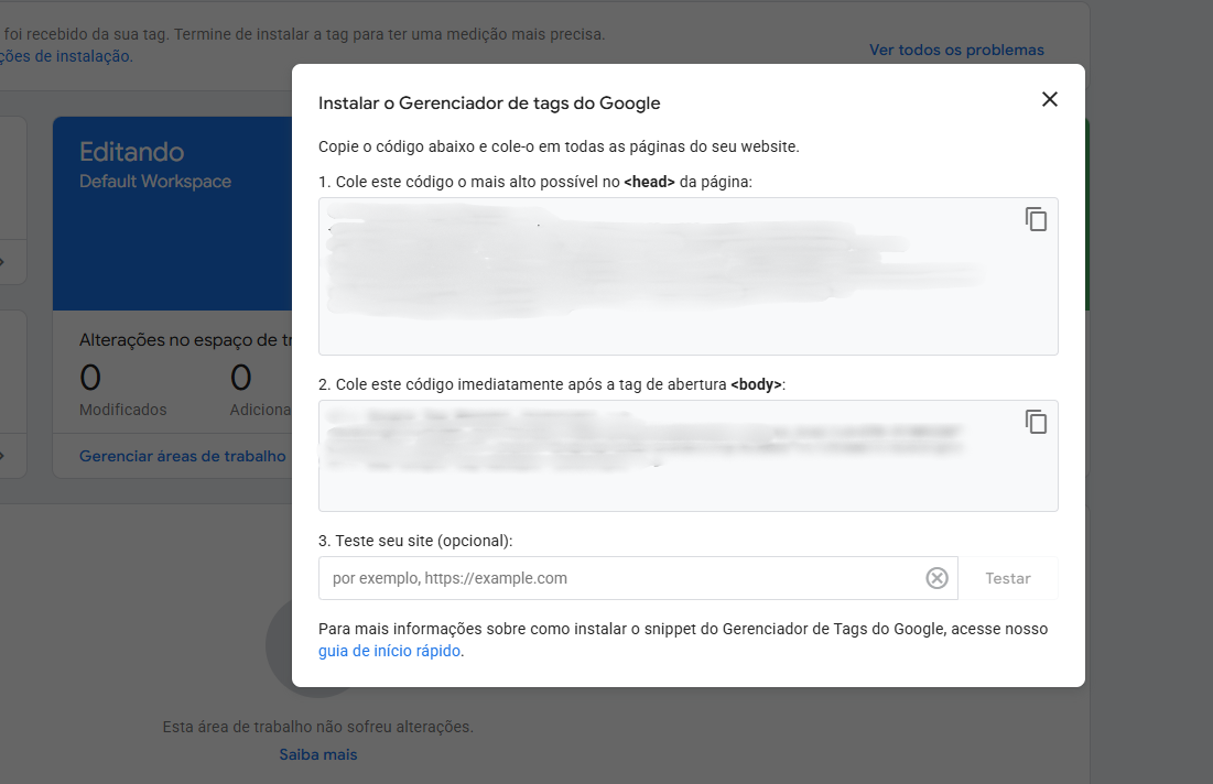 Assim que o contêiner for criado, o GTM vai gerar dois trechos de código: