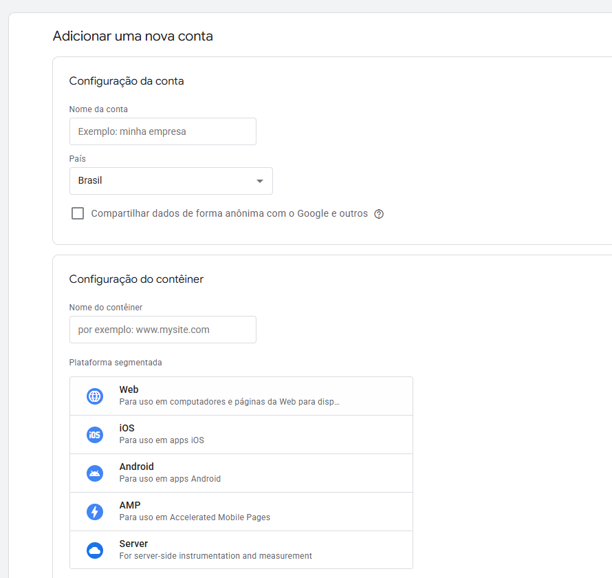 No campo Nome da Conta, insira o nome da sua empresa ou projeto.