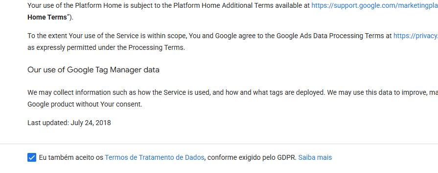 Leia e aceite os termos do Google Tag Manager.