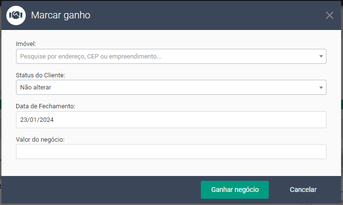 Quando o negócio for marcado como ganho será possível informar qual o imóvel que foi negociado e também atualizar o valor do negócio.