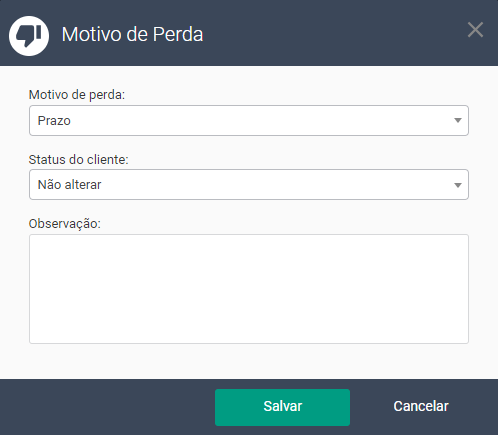 Ao registrar a perda haverá o campo Motivo de perda, possibilitando, portanto, mensurar as perdas e analisar os motivos.